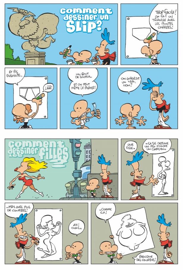 Deux professeurs hors pair ont décidé de nous donner des leçons de dessin : Tébo, double médaillé d’or (au moins !) de la peinture à doigt et futur candidat au patrimoine mondial du bon goût, et Zep, maître du crayon gris dont le célèbre Titeuf finira bien un jour au Louvre, dit-on.